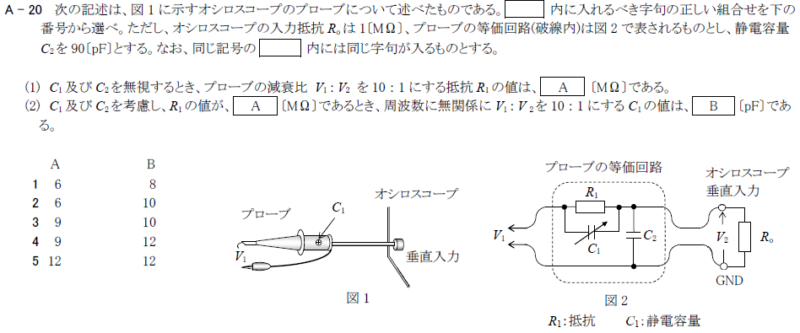 (2)\(C_1\)及び\(C_2\)を考慮し、\(R_1\)の値が、\(R_1=9R_2\)[MΩ]であるとき、周波数に無関係に\(V_1:V_2\)を\(10:1\)にする\(C_2\)の値は、( )[pF]である。