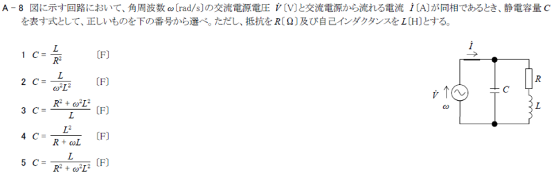 角周波数ω〔rad/s〕の交流電源電圧V̇〔V〕と交流電源から流れる電流I ̇〔A〕が同相であるとき、静電容量Cを表す式