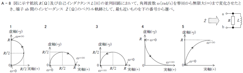 図に示す抵抗R[Ω]及び自己インダクタンスL[H]の並列回路において、角周波数\(ω\)[rad/s]を零(0)から無限大(∞)まで変化させたとき、端子ab間のインピーダンス\(\dot{Z}\)[Ω]のベクトル軌跡