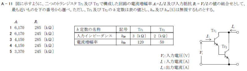 図に示すように、二つのトランジスタ\(Tr_1\)及び\(Tr_2\)で構成した回路の電流増幅率\(A_i=I_o/I_i\)及び入力抵抗\(R_i=V_i/I_i\)の値