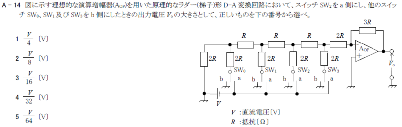 図に示す理想的な演算増幅器(Aop)を用いた原理的なラダー(梯子)形D-A変換回路において、スイッチ\(SW_3\)をa側にし、他のスイッチ\(SW_0\)、\(SW_1\)及び\(SW_2\)をb側にしたときの出力電圧\(V_o\)の大きさ