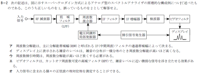 イ 2 ディスプレイ上に表示される雑音のレベルは、雑音の分布が一様分布のとき周波数分解能が高いほど高くなる。 低くなる。