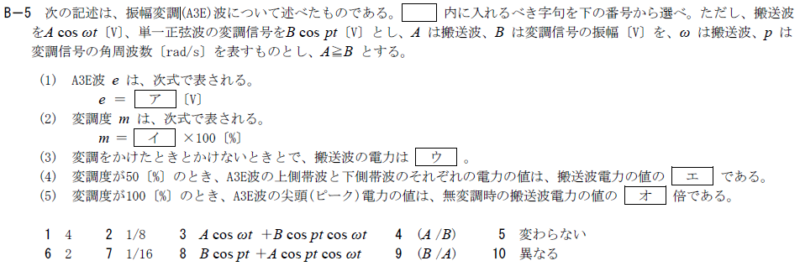 4 変調度が50[%]のとき、A3E波の上側波帯と下側波帯の電力の値の和は、搬送波電力の値の1/4倍 1/8倍である。
