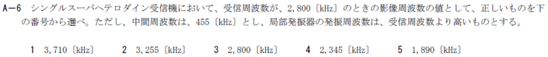 ・シングルスーパヘテロダイン受信機において、受信周波数が、2,800[kHz]のときの影像周波数の値