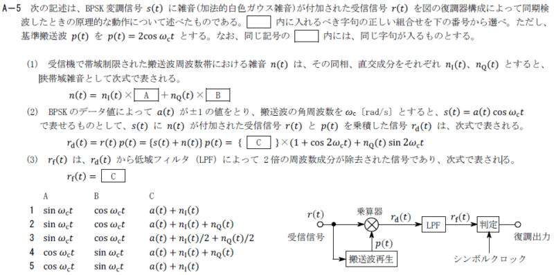・BPSK変調信号s(t)に雑音(加法的白色ガウス雑音)が付加された受信信号r(t)を図の復調器構成によって同期検波したときの原理的な動作