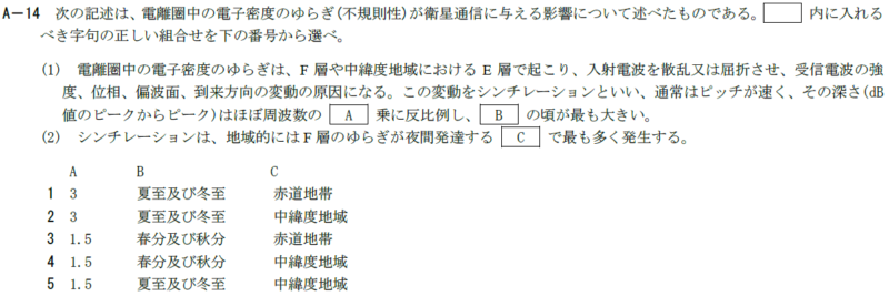 2 固定衛星通信の対流圏におけるシンチレーションは、低仰角の場合は変動幅が小さく、 大きく、また、その周期は電離圏シンチレーションの周期に比べると短い。 長い。