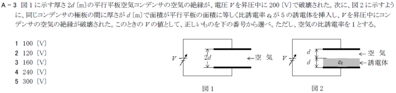 ・図1に示す厚さ2d[m]の平行平板空気コンデンサの空気の絶縁が、電圧Vを昇圧中に200[V]で破壊された。次に、図2に示すように、同じコンデンサの極板の間に厚さがd[m]で面積が平行平板の面積に等しく比誘電率εrが5の誘電体を挿入し、Vを昇圧中にコンデンサの空気の絶縁が破壊された。このときのVの値