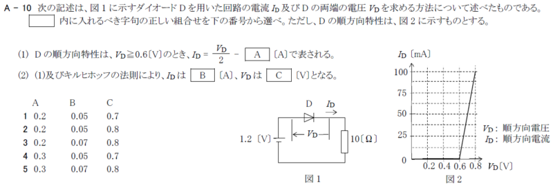 図1に示すダイオードDと抵抗Rを用いた回路に流れる電流\(I_D\)及びDの両端の電圧\(V_D\)の値