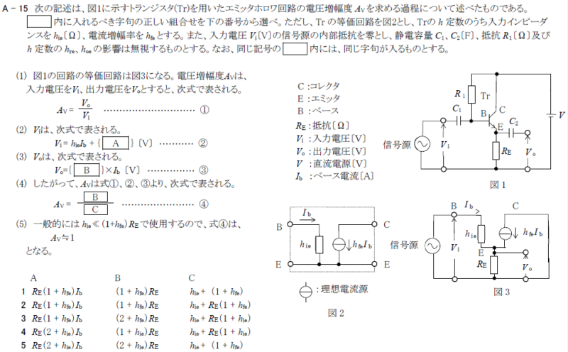 図1に示すトランジスタ(Tr)を用いたエミッタホロワ回路の電圧増幅度AVを求める過程