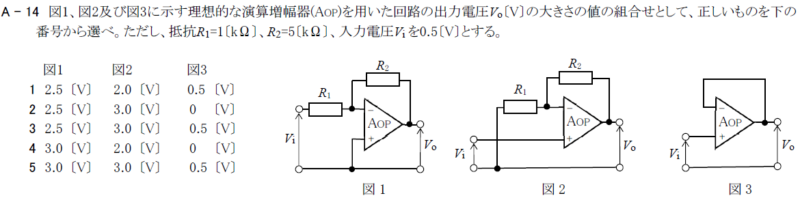 図1、図2及び図3に示す理想的な演算増幅器(Aop)を用いた回路の出力電圧\(\dot{V}_o\)[V]の大きさの値の組合せ
