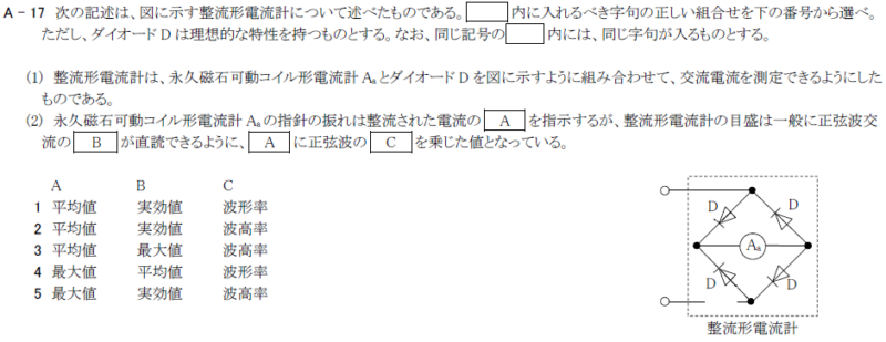 基礎905 科目別 1技 基礎問題一覧 2025.12.072024.02.12 R7.01-1A17 R3.01-1A17 解答へ 解答 R7.01-1A17 1 平均値 実効値 波形率 ワンポイント解説 整流形電流計 平均値 実効値 波形率 整流した電流計は、平均的に 実効する 波形 R3.01-1A17 2 平均値 実効値 波形率 前の問題へ 次の問題へ 検索用キーワード(問題文の最初の一文) 図に示す整流形電流計