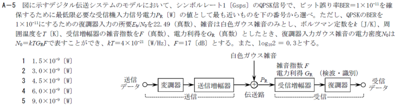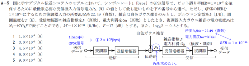 図に示すデジタル伝送システムのモデルにおいて、シンボルレート1[Gsps]のQPSK信号で、ビット誤り率BER\(=1×10^{-11}\)を確保するために最低限必要な受信機入力信号電力PR[W]の値