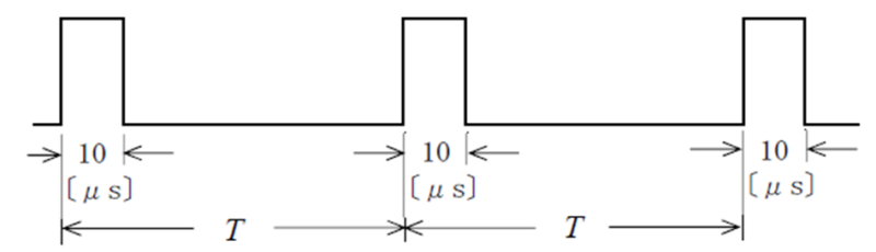 図に示すようにパルスの幅が10〔μs〕のとき、パルスの繰返し周期T 及び衝撃係数(デューティファクタ) D の値の組合せとして、正しいものを下の番号から選べ。ただし、パルスの繰返し周波数は20〔kHz〕とする。