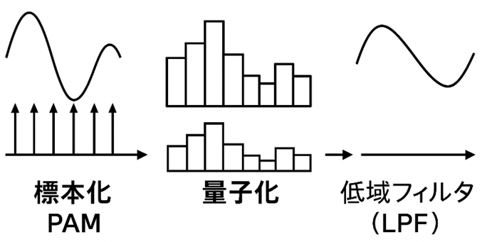 (2) 振幅を所定の幅ごとの領域に区切ってそれぞれの領域を1 個の代表値で表し、標本化によって取り出したアナログ信号の振幅を、その代表値で近似することを( 量子化 )という。