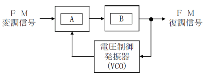 無線工学504(3) 無線工学 5無線送受信装置 2025.11.26 R7.10b-12 図は、位相同期ループ(PLL)を用いた周波数変調(FM)波の復調器の原理的構成例である。( )内に入れるべき名称の正しい組合せを下の番号から選べ。 A B 1 位相比較器 低域フィルタ(LPF) 2 位相比較器 圧縮器 3 識別器 低域フィルタ(LPF) 4 識別器 圧縮器 解答へ 解答 1 位相比較器 低域フィルタ(LPF) ワンポイント解説 PLL復調器 PC:位相比較器(2入力の位相を比較) LPF:ローパスフィルター(ローパスを通して出力) VCO:電圧制御発振器(出力波形から位相を調整) 前の問題へ 次の問題へ