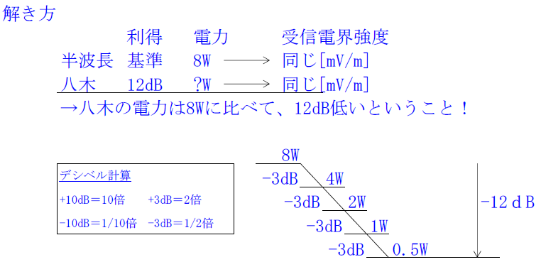 半波長ダイポールアンテナに対する相対利得が12〔dB〕の八木・宇田アンテナから送信した最大放射方向にある受信点の電界強度は、同じ送信点から半波長ダイポールアンテナに8〔W〕の電力を供給し送信したときの、最大放射方向にある同じ受信点の電界強度と同じであった。このときの八木・宇田アンテナの供給電力の値として、最も近いものを下の番号から選べ。ただし、アンテナの損失はないものとし、\(log_{10}{2}\)=0.3とする。