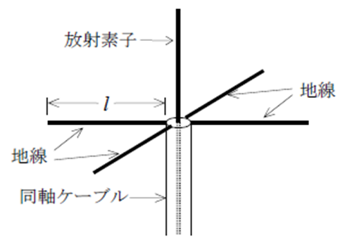 図に示すブラウンアンテナを周波数100〔MHz〕で使用するときの地線の長さl の値として、最も近いものを下の番号から選べ。