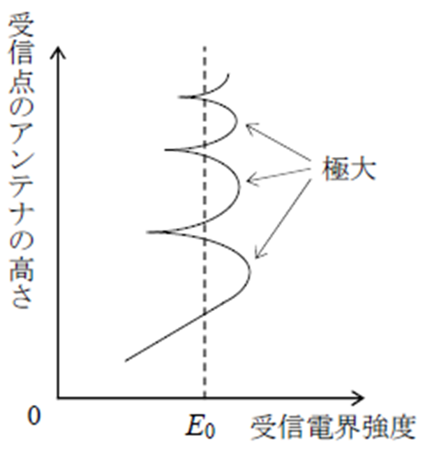 (1)  受信点のアンテナの高さを変化させると、直接波と( 大地反射波 )との通路差が変わるため、受信電界強度は、両波の( 干渉 )によって直接波の電界強度\(E_0\)より強くなったり弱くなったりして変化する。