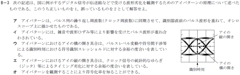 オ 2 アイパターンを観測することにより符号化率 受信信号の雑音に対する余裕(マージン)を知ることができる。