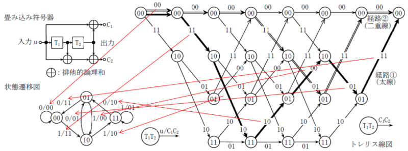 ・デジタル伝送の誤り訂正符号である畳み込み符号について、図に示す符号器のシフトレジスタの状態(“0”または“1”)と入力uに応じて2つの符号\((C_1 C_2)\)を出力して変化する様子を示す状態遷移図及びそれを時系列(ステップ毎)に書換えたトレリス線図から、ビタビ復号法までの原理的な動作