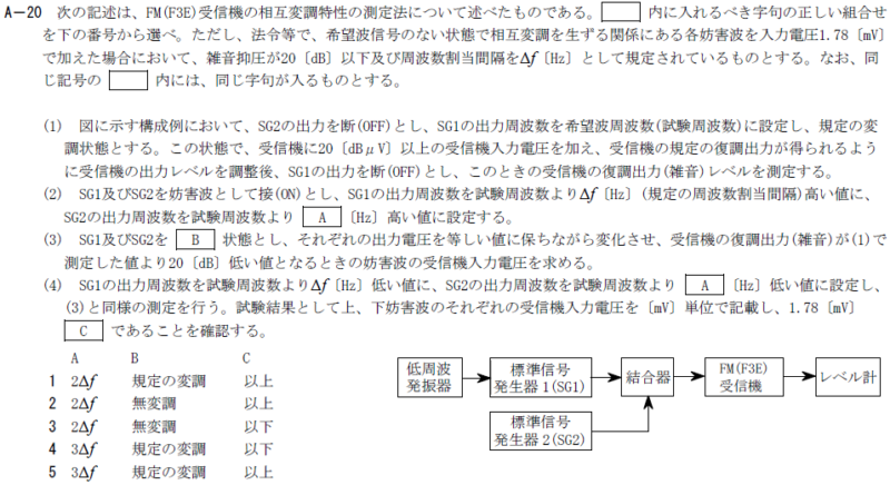 無線工学A1411 科目別 1技 工学A問題一覧 2025.12.032024.05.20 R7.01-1A20 R5.07-1A18 R4.07-1A18 R3.01-1A18 解答へ 解答 R7.01-1A20 2 2Δf 無変調 以上 ワンポイント解説 図で覚えちゃいましょう。 R5.07-1A18 1 2Δf 無変調 以上 R4.07-1A18 3 2Δf 無変調 以上 R3.01-1A18 4 断(OFF) 2Δf 以上 前の問題へ 次の問題へ 検索用キーワード(問題文の最初の一文) ・FM(F3E)受信機の相互変調特性の測定法
