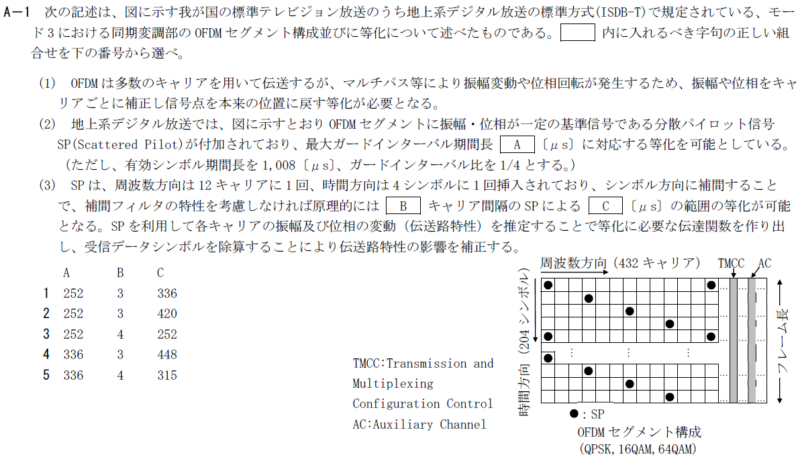 ・図に示す我が国の標準テレビジョン放送のうち地上系デジタル放送の標準方式(ISDB-T)で規定されている、モード3における同期変調部のOFDMフレーム構成並びに等化