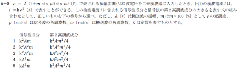 ・\(e=A(1+m\sin{pt})\sin{ωt}\)[V]で表される振幅変調(A3E)波電圧を二乗検波器に入力したとき、出力の検波電流iは、\(i=ke^2\)[A]で表すことができる。この検波電流iに含まれる信号波の第2高調波成分の大きさを表す式