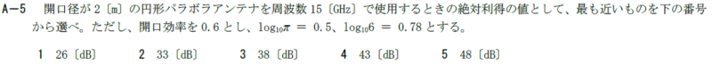 開口径が2[m]の円形パラボラアンテナを周波数15[GHz]で使用するときの絶対利得の値