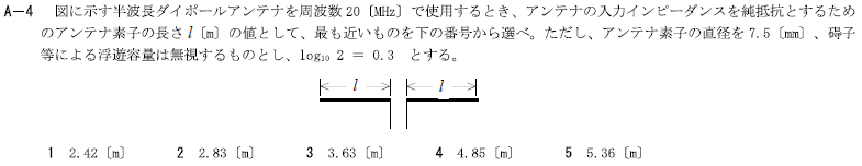図に示す半波長ダイポールアンテナを周波数15[MHz]で使用するとき、アンテナの入力インピーダンスを純抵抗とするためのアンテナ素子の長さl[m]の値