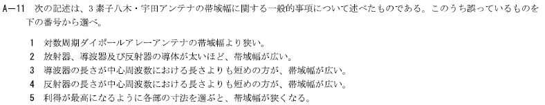 3 放射器、導波器及び反射器の導体が太いほど、帯域幅が狭い。 広い。