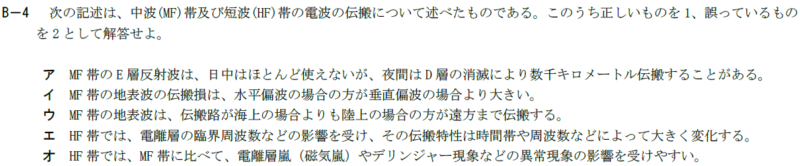 イ 2 MF帯の地表波の伝搬損は、垂直偏波 水平偏波の場合の方が水平偏波 垂直偏波の場合より大きい。