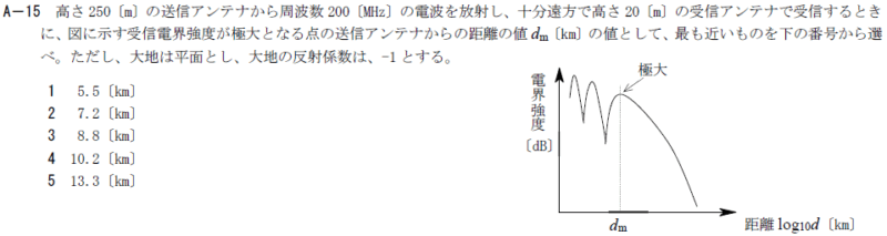 高さ250〔m〕の送信アンテナから周波数200〔MHz〕の電波を放射し、十分遠方で高さ20〔m〕の受信アンテナで受信するときに、図に示す受信電界強度が極大となる点の送信アンテナからの距離の値\(d_m\)〔km〕の値