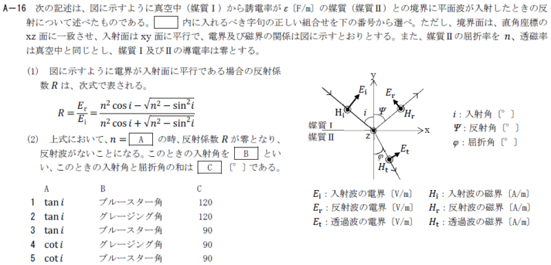 図に示すように真空中(媒質Ⅰ)から誘電率がε[F/m]の媒質(媒質Ⅱ)との境界に平面波が入射したときの反射