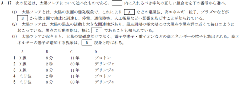 無線工学B435 科目別 1技 工学B問題一覧 2025.11.282024.10.06 R7.01-1A17 R5.07-1A17 解答へ 解答 R7.01-1A17 1 X線 8分 11年 プロトン ワンポイント解説 語呂合わせ X線 8分 11年 プロトン 太陽フレアのX線は、8分で到着。プロトンは11年。 R5.07-1A17 3 X線 8分 11年 プロトン 前の問題へ 次の問題へ 検索用キーワード(問題文の最初の一文) 太陽フレア