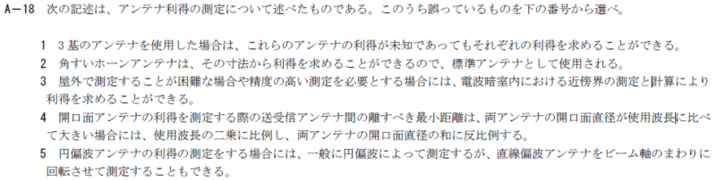 4 開口面アンテナの利得を測定する際の送受信アンテナ間の離すべき最小距離は、両アンテナの開口面直径が使用波長に比べて大きい場合には、使用波長の二乗に比例し、両アンテナの開口面直径の和に反比例する。 使用波長に反比例し、両アンテナの開口面直径の和の2乗に比例する。 最小距離\(R_{min}=\frac{2D^2}{λ}\)