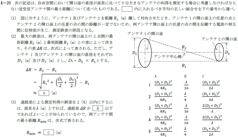 自由空間において開口面の直径が波長に比べて十分大きなアンテナの利得を測定する場合に考慮しなければならない送受信アンテナ間の最小距離