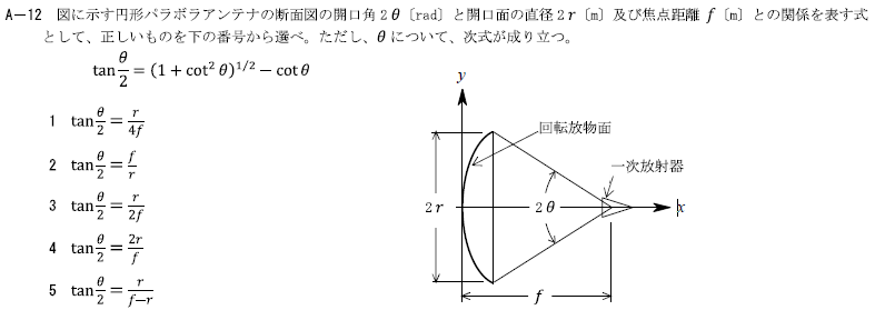 図に示す円形パラボラアンテナの断面図の開口角2θ[rad]と開口面の直径2r[m]及び焦点距離f[m]との関係を表す式