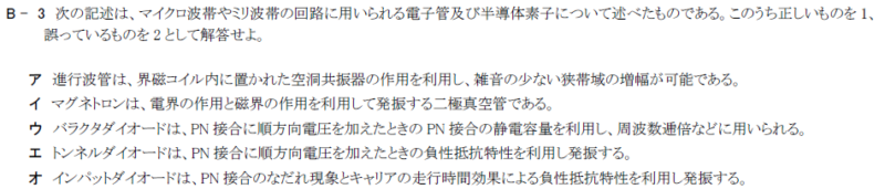 ウ 2:進行波管は、界磁コイル内に置かれた空洞共振器 ら旋遅延回路の作用を利用し、雑音の少ない狭帯域 広帯域の増幅が可能である。