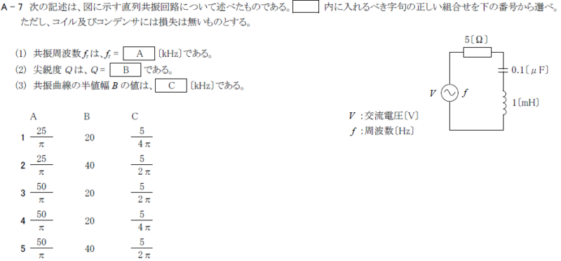 帯域幅\(B=f2−f1=\frac{f_Γ}{Q}=\frac{\frac{50}{π}k}{50}=\frac{1}{π}[kHz]\)
